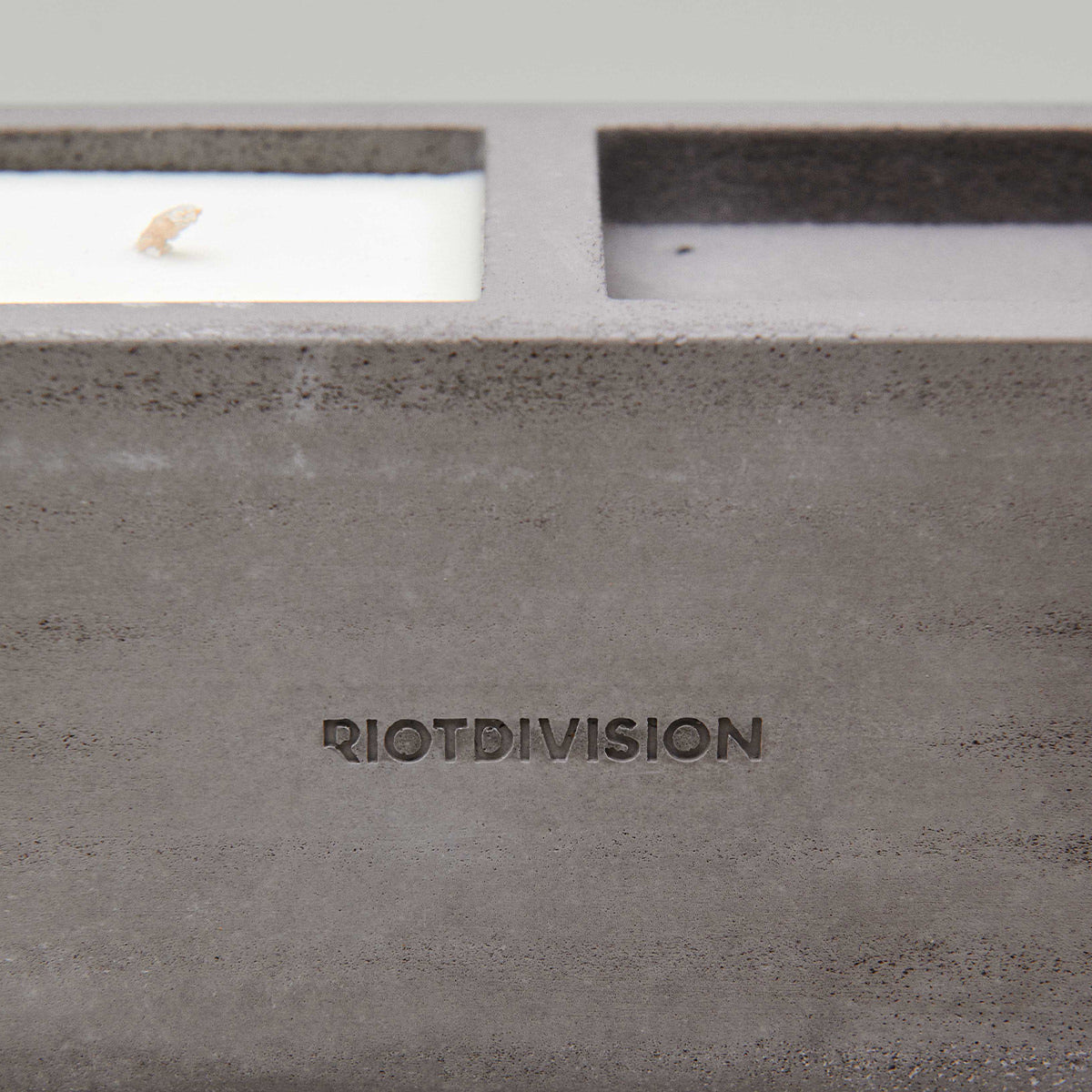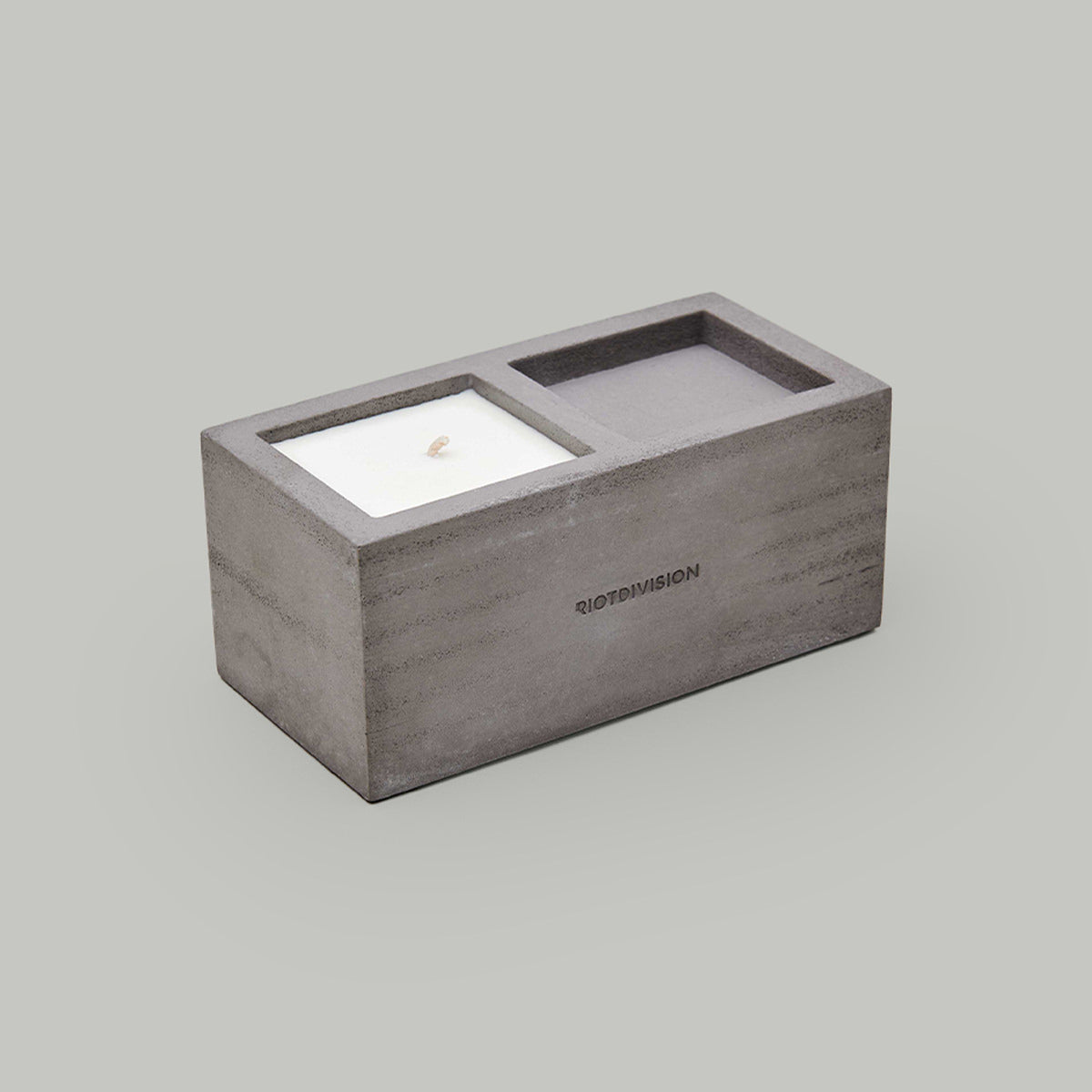 Свічка з ароматом паленої гуми та дерева в бетонному підсвічнику.