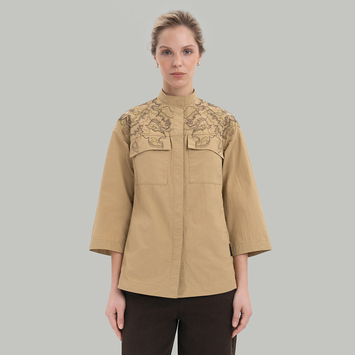 Жіноча сорочка пісочного кольору з дропу Etnodim x RIOTDIVISION.