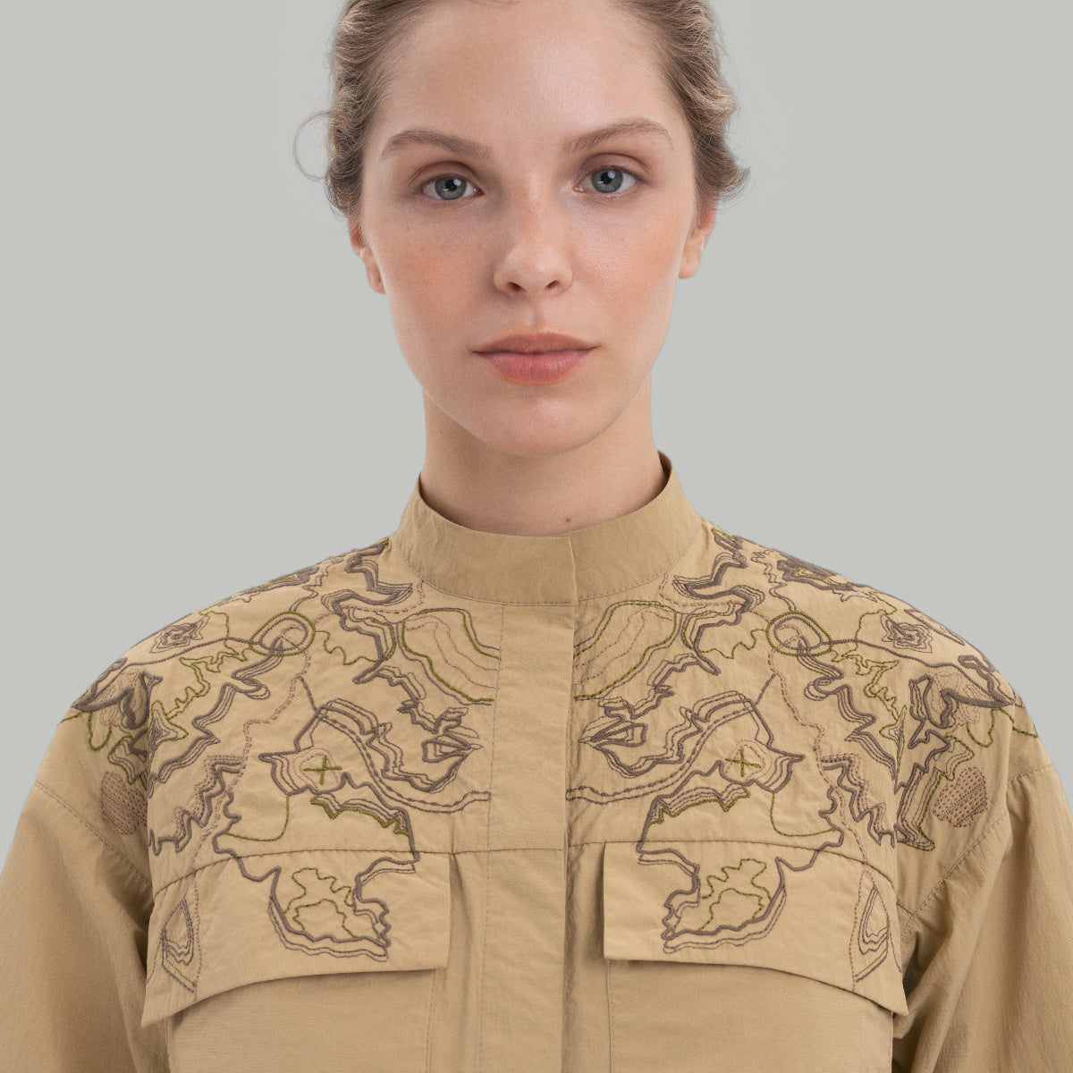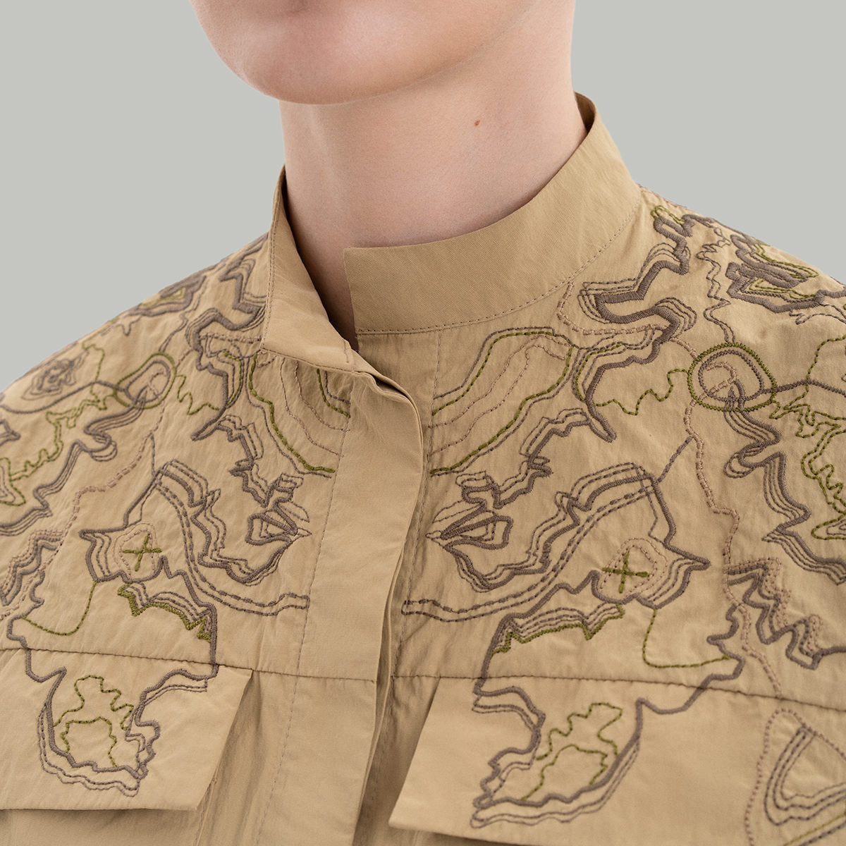 Верхню частину сорочки прикрашає вишивка, виконана бавовняними нитками трьох відтінків: коричневого, бежевого та зеленого. Переплітаючись, вишиті лінії утворюють топографічну мапу Холодного Яру. Ця унікальна система ярів, що простягається на 250 кілометрів, є однією з найяскравіших сторінок визвольної боротьби в Україні.
